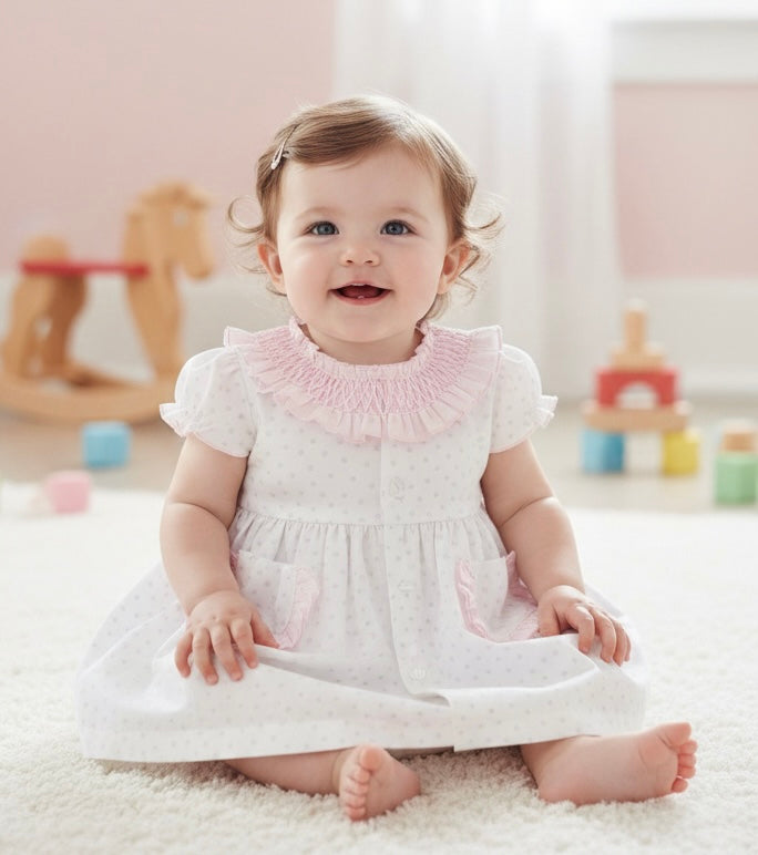 Baby girls white and pink heart print smocked collar dress